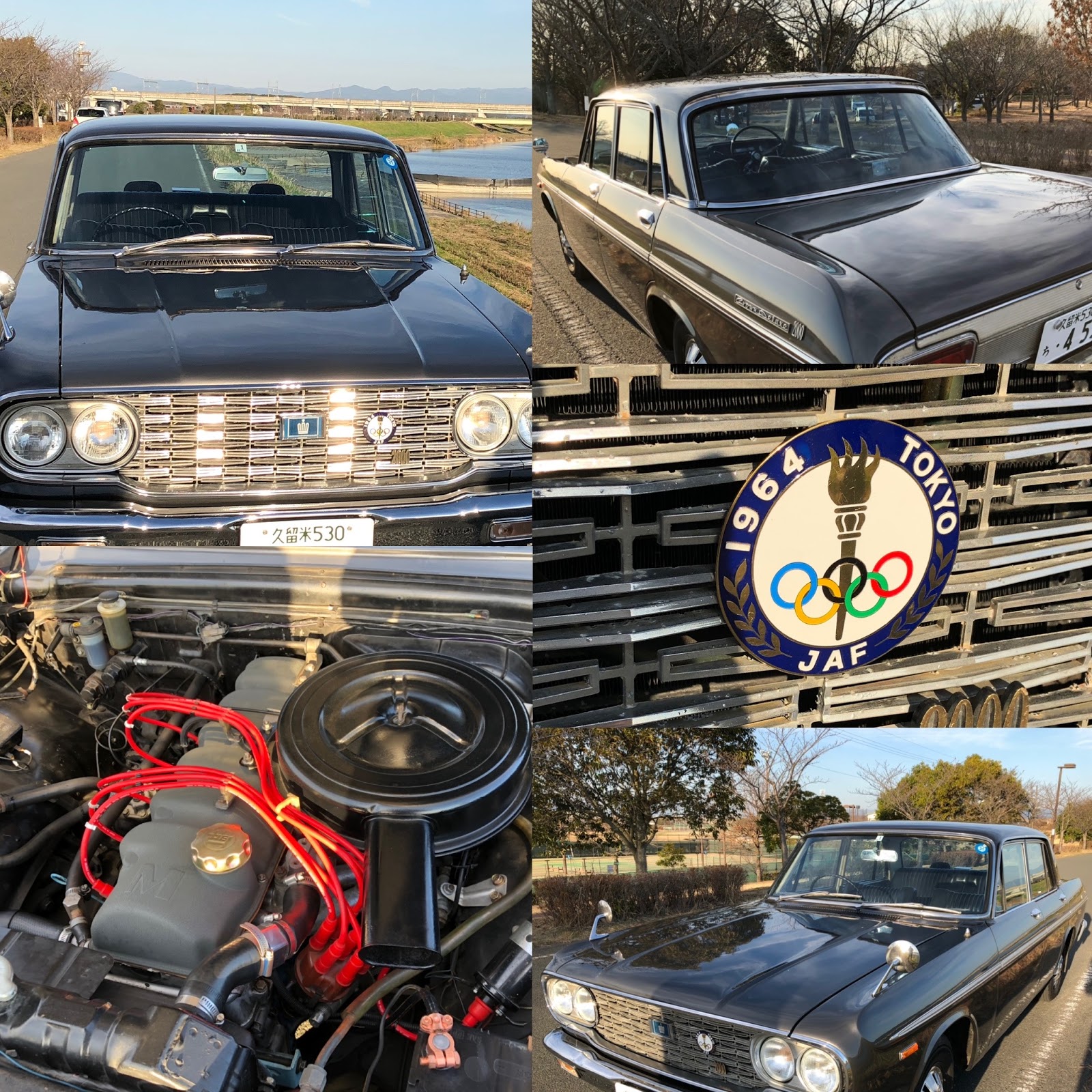 ランニング中すれ違いオーナーに写真撮影を依頼 入社時整備の実習に分解組み付けした車両です。65年前の車です。 リストアされた当時のままです。エンジンルームもピカピカ、JAFのエンブレムが前のオリンピックバージョンこれだけでも3万はします。 交換部品はタイなどから手に入れているそうです。